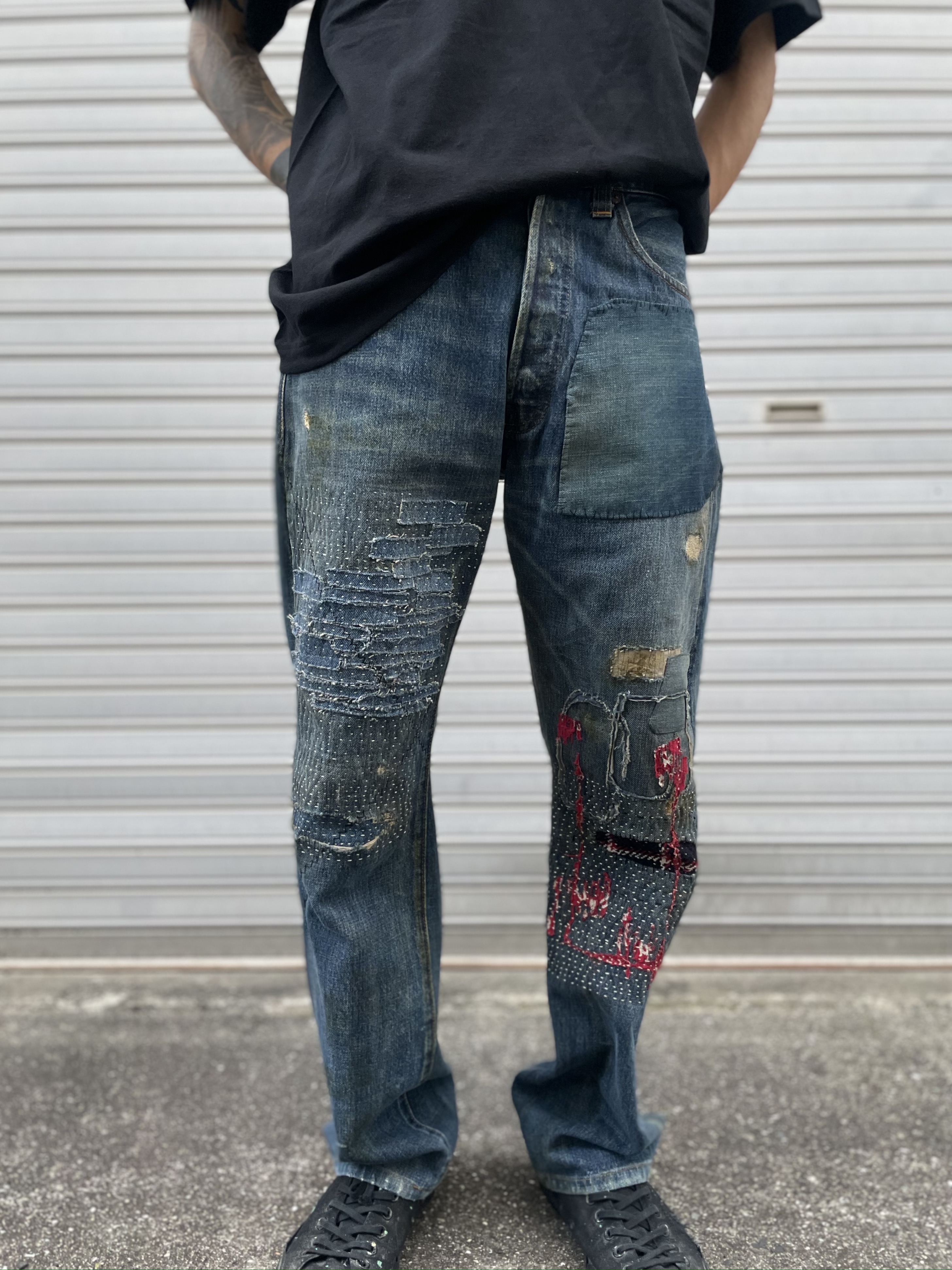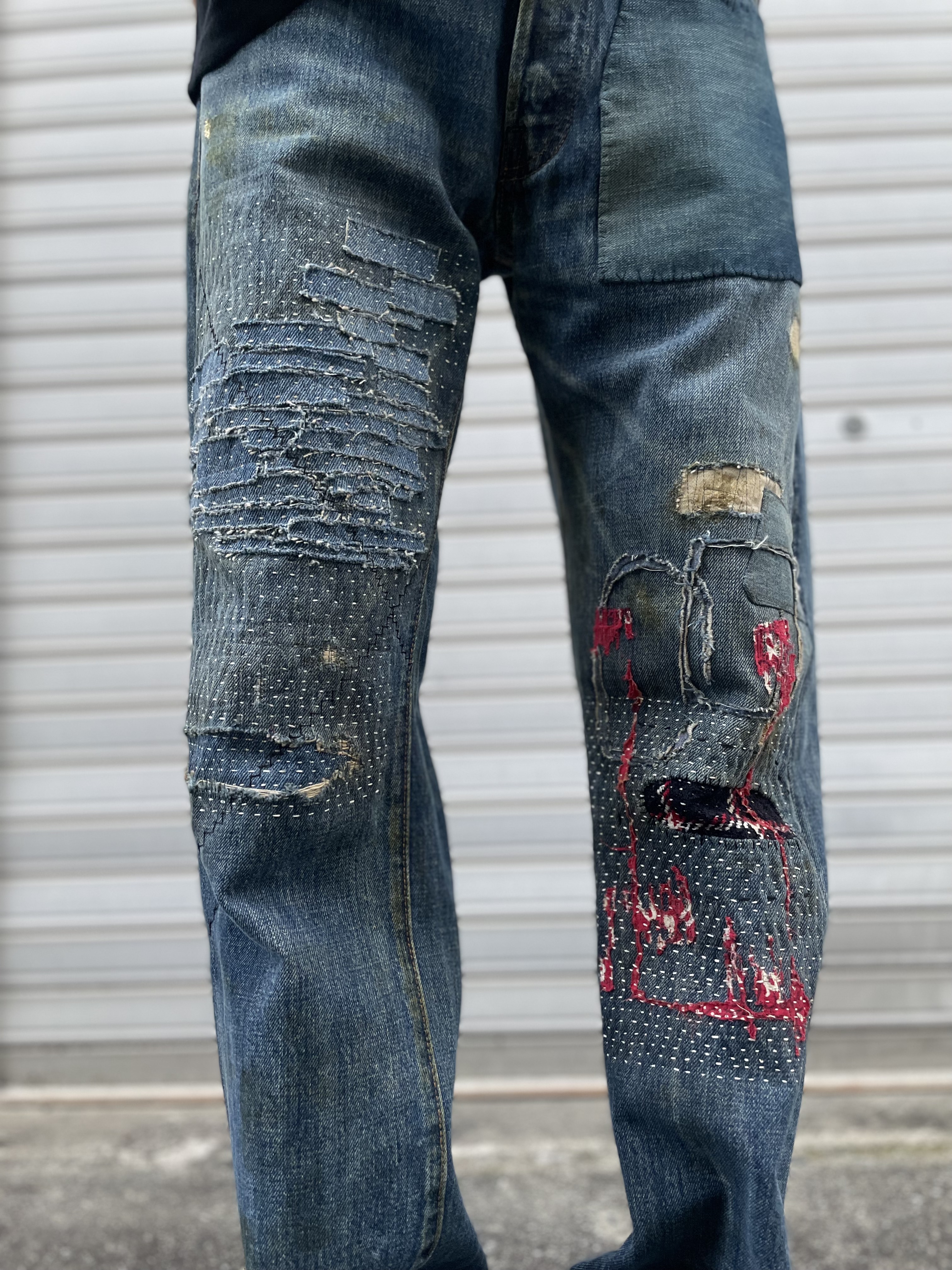一見、派手なジーパンですが手縫いならではの優しい表情もあり